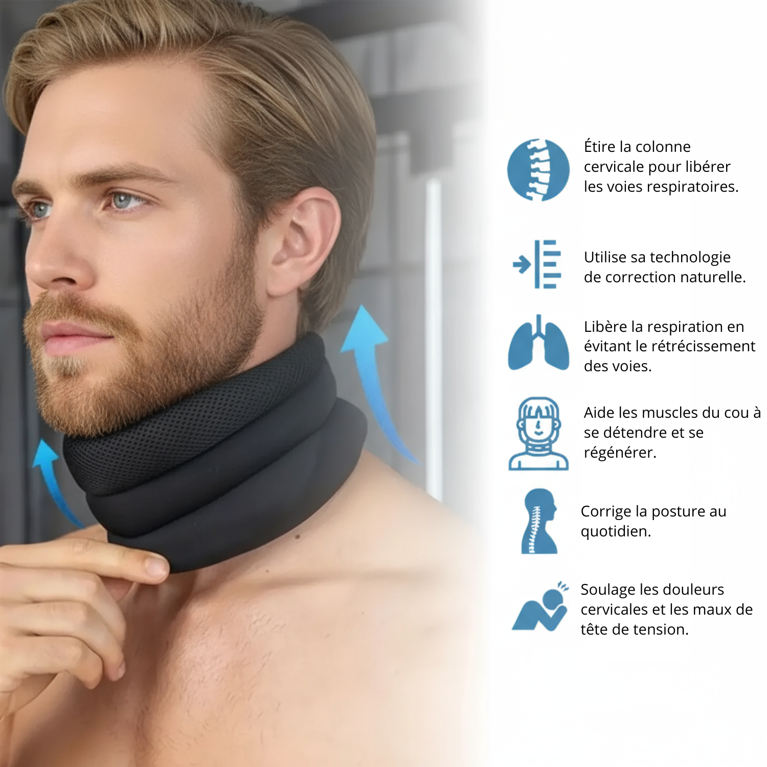 Le réalignement de la colonne cervicale empêche le rétrécissement de la gorge, permettant à l’air de circuler librement et évitant les vibrations de la gorge ainsi que les problèmes respiratoires.